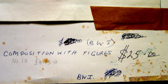 None of Gloria Escoffery's work have been auctioned to date, or at least there is no record of such. This is titled Composition with Figures. The matte is not acid free and shows signs of foxing, I have contrasted the title so it would show up better. The actual print measures 18 inches by 20 inches. An image taken at Roadshow of yours truly with new Antiques Roadshow host, Mark Walberg.