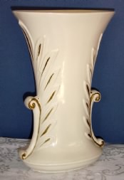 This is a large Abingdon vase. Ivory in color, it is in excellent vintage condition. It has a leaf pattern with scroll sides. Measurements are 11 inches by 7 inches across the top. $65.00 USD.