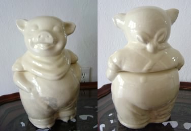 Large very old piggy cookie jar. Approximately 12 inches high, 9 inches across at widest. Vintage condition, grey spot on front. Unpriced.